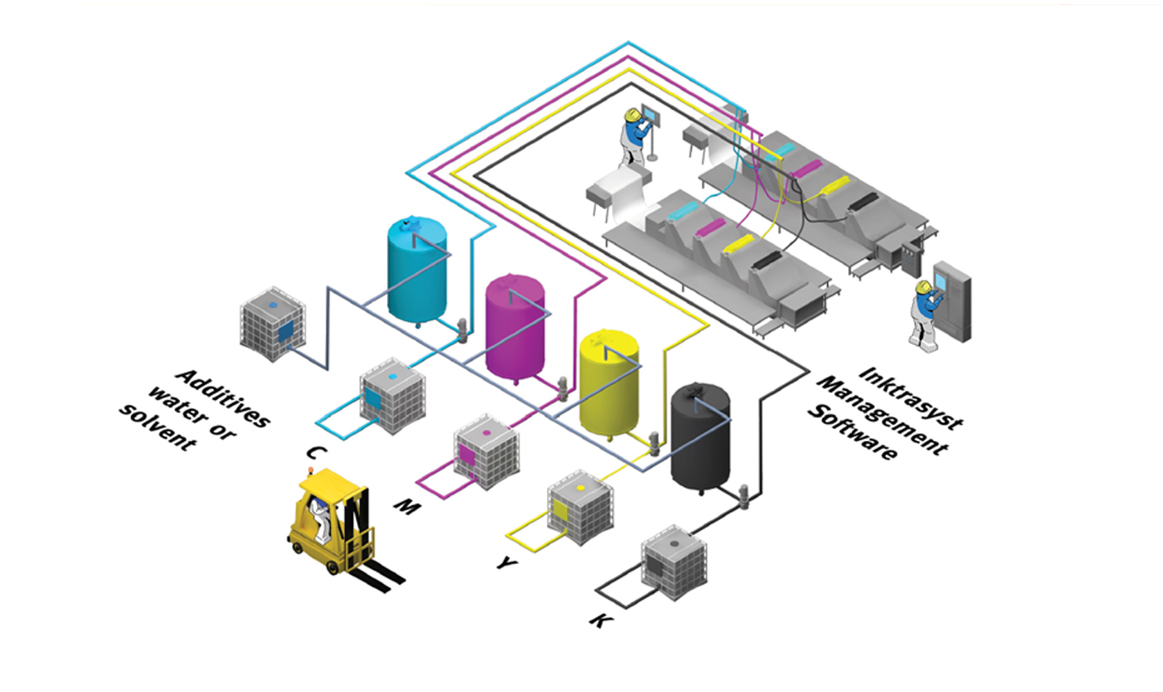 This easy-to-use system is a printing-press distribution network, for transferring white, CMYK or expanded color gamut, when needing to transfer one or more products to different discharge points quickly and precisely, it includes: